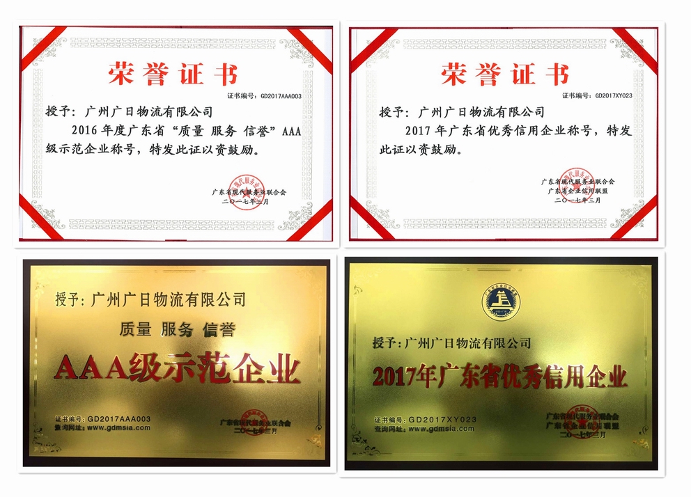 廣日物流榮獲“廣東省優(yōu)秀信用企業(yè)”和“廣東省‘質(zhì)量 服務(wù) 信譽(yù)’AAA級示范企業(yè)”稱號
