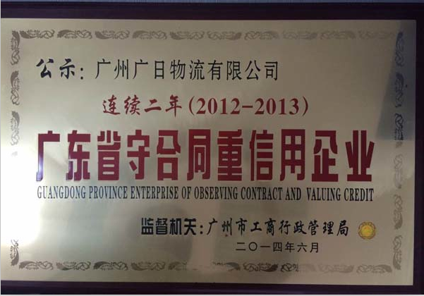 廣日物流連續(xù)兩年被評(píng)為“廣東省守合同重信用”企業(yè)