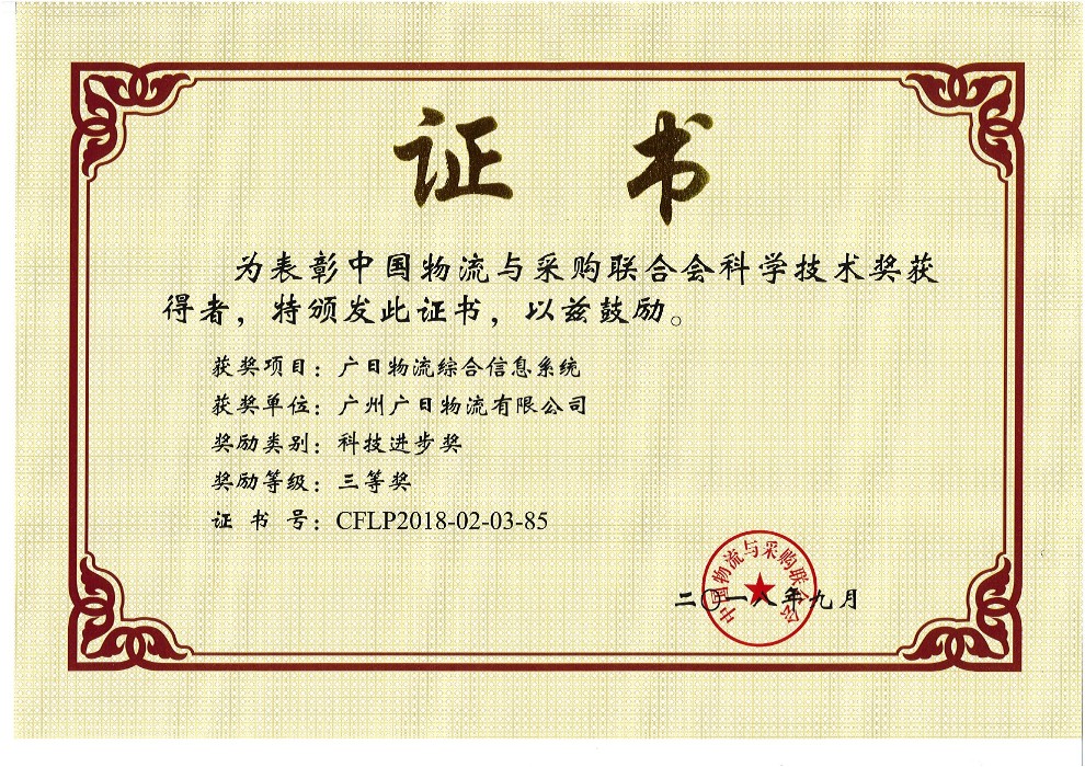 廣日物流綜合信息系統(tǒng)榮獲“中國(guó)物流與采購(gòu)聯(lián)合會(huì)科技進(jìn)步獎(jiǎng)三等獎(jiǎng)”