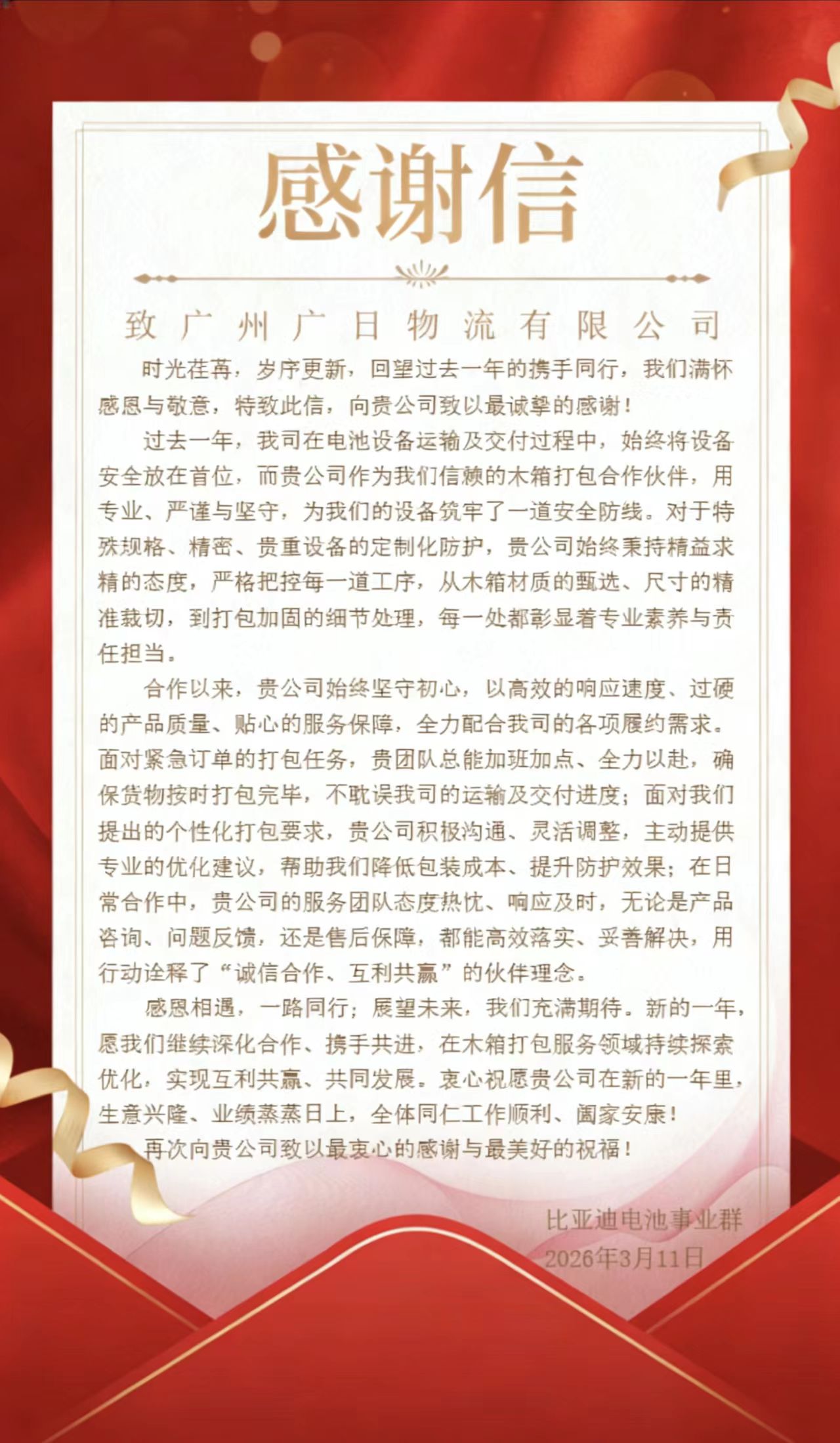 一封感謝信,一份認可,一份責(zé)任。廣日物流將持續(xù)深耕新能源領(lǐng)域,錘煉專業(yè)服務(wù)能力,優(yōu)化定制化包裝及物流配套服務(wù),深化與比亞迪電池事業(yè)群等廣大客戶的合作,以務(wù)實作風(fēng)與專業(yè)實力,筑牢企業(yè)口碑,在互利共贏中實現(xiàn)高質(zhì)量發(fā)展。同時,感謝比亞迪電池事業(yè)群的信任與支持,祝愿雙方合作持續(xù)深化,共同實現(xiàn)更高質(zhì)量的發(fā)展。