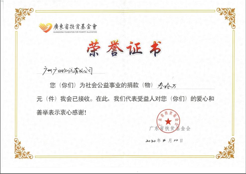 為助力精準扶貧、弘揚慈善文化,2019年4月,廣州廣日物流有限公司參加廣東省扶貧基金會扶貧募捐活動,捐款金額為叁拾萬元。廣東省教育基金會向廣日物流頒發(fā)了榮譽證書以表感謝。